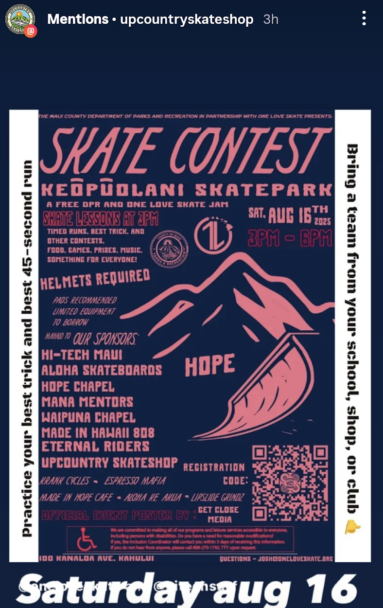 Video from @GetCloseMedia of last event and other media from last community event with the county of maui here: https://www.oneloveskate.org/blog/2025/6/9/-kihei-skate-contest-congrats-to-these-winners