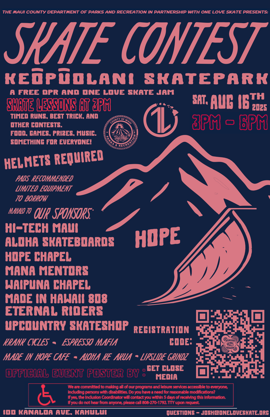 The County of Maui Department of Parks and Recreation (DPR) and One Love Skate are partnering to host a free Skate Jam event from 3 to 6 p.m. Saturday, Aug. 16, 2025, at Keōpūolani Skatepark in Kahului.